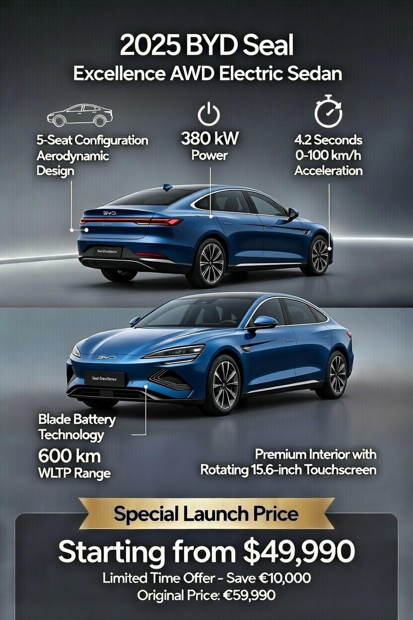 Experience premium electric driving with the 2025 BYD Seal Excellence – a dynamic 5-seater sports sedan that combines futuristic design, blistering performance, and cutting-edge EV technology. Built on BYD's advanced e-Platform 3.0, it features the ultra-safe Blade Battery, aerodynamic styling for efficiency, and a driver-focused cockpit. Perfect for those seeking Tesla-rivaling speed and range in a more affordable, feature-packed package.